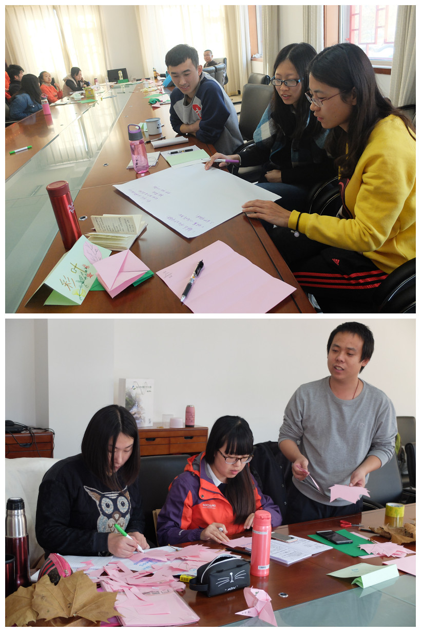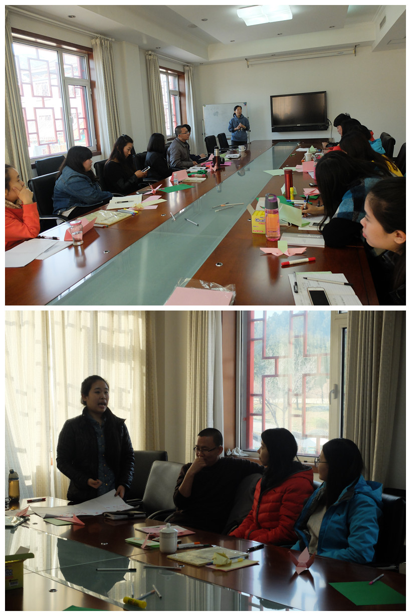 第一天上午,康耘老师从资源分析、需求分析、确立目标和明确主题四个方面对课程设计进行系统地讲解,学员小组内讨论加深理解。下午分小组在室外进行活动演练,四个小组针对不同受众群体设计20分钟不同主题的体验活动。小组成员分工合作,自制道具,结束后回到室内大家对彼此的活动进行总结,分享值得学习的部分和可以改进的部分,吸取经验。康老师也就活动中需要掌握的技巧进行了补充说明。