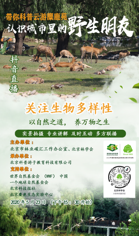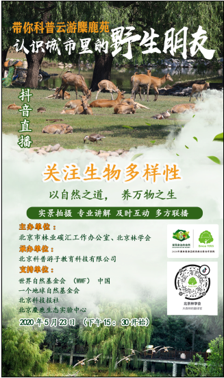 新冠疫情给世人敲响了警钟,也促使国人更加关注自然生态环境! 近日“国际生物多样性日”宣传活动在京举行,中共中央政治局常委、国务院总理李克强作出重要批示,批示指出“生物多样性是人类生存和发展、人与自然和谐共生的重要基础” 。“生物多样性保护”和“生态文明教育”已经成为政府与公众普遍关注的重要课题。 在李克强总理重要批示精神的鼓舞激励下,5月23日下午,由北京林学会、北京市林业碳汇工作办公室、科普游子、世界自然基金会(WWF)中国、一个地球自然基金会、北京麋鹿生态实验中心(北京生物多样性保护研究中心)等联合举办的森林云课堂第五场“云游麋鹿苑——认识城市里的野生朋友”直播活动在北京市大兴区麋鹿苑成功举办。