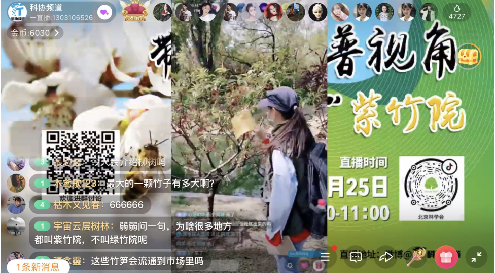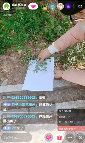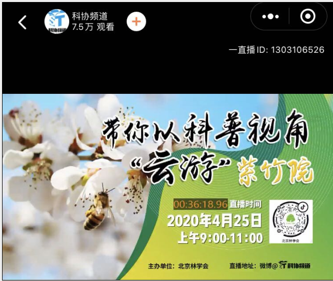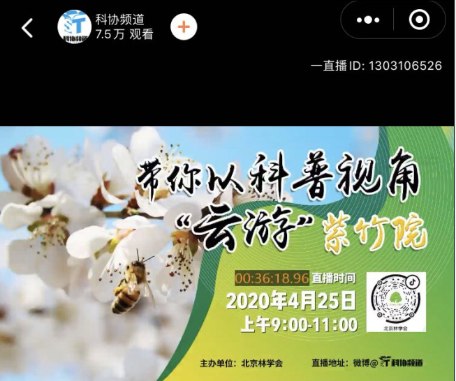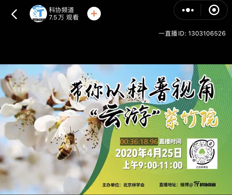 ——4月25日上午,北京林学会、北京市林业碳汇工作办公室、科普游子、北京市紫竹院公园管理处,在紫竹院公园成功举办了“森林云课堂”系列活动的第二场——“科普云游紫竹院”,共有5万多人次一起参加了这次云游活动。