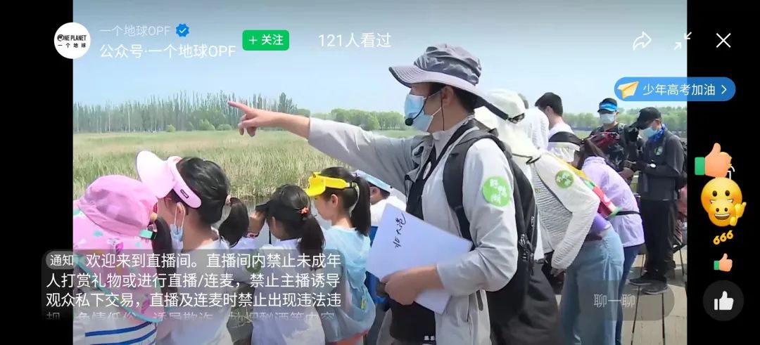 6月18日,30个都市家庭50余人来到了位于延庆的北京野鸭湖国家湿地公园,参与为期一天的自然科普教育活动。本次活动是在北京市延庆区自然保护地管理处、阿里巴巴公益基金会和深圳市一个地球自然基金会支持下,由北京林学会、科普游子共同组织实施。除线下体验活动外,还同步在一个地球自然基金会的微博、微信视频号、抖音平台做了全天直播,总时长5.15小时,吸引了很多热爱自然的朋友在线上观看和参与本场活动,三个平台的线上参与观众总人数达到1134人。其中,微博话题#让梦想飞的更野#的阅读量累计315.8万,讨论次数达到3835次。参与家庭在植物和鸟类学者以及野鸭湖湿地工作人员的带领下认识了鸟类、植物和湿地环境,学习了树木保护知识,履行了义务植树尽责义务,完成了一天精彩的自然体验。