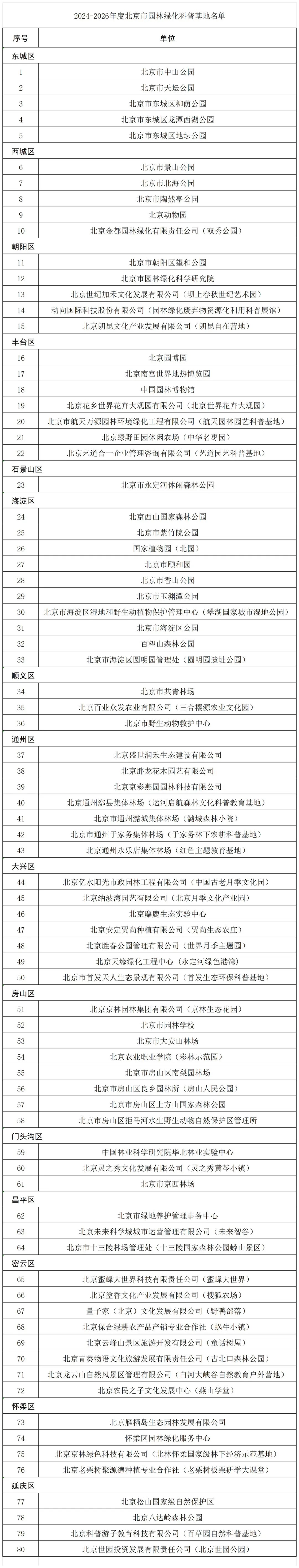 根据北京市园林绿化科普工作的相关要求,经过考核评估和申报评审,截至2023年底,共有80家单位成为“2024-2026年度北京园林绿化科普基地”。欢迎市民朋友探索体验。