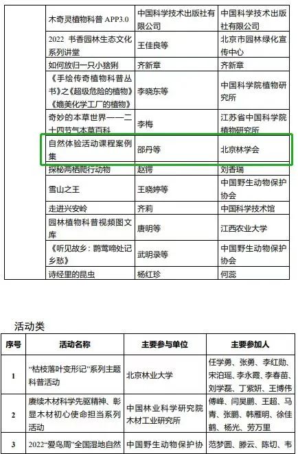 近日,中国林学会公布了第十二届梁希科普奖评选结果(中林会普字〔2024〕20号),其中,由北京林学会、北京市园林绿化局、北京市园林绿化科学研究院、动向国际科技股份有限公司共同组织筹备的《北京园林绿化科技周宣传活动》成果荣获科普活动奖,《自然体验活动课程案例集》荣获作品类三等奖。