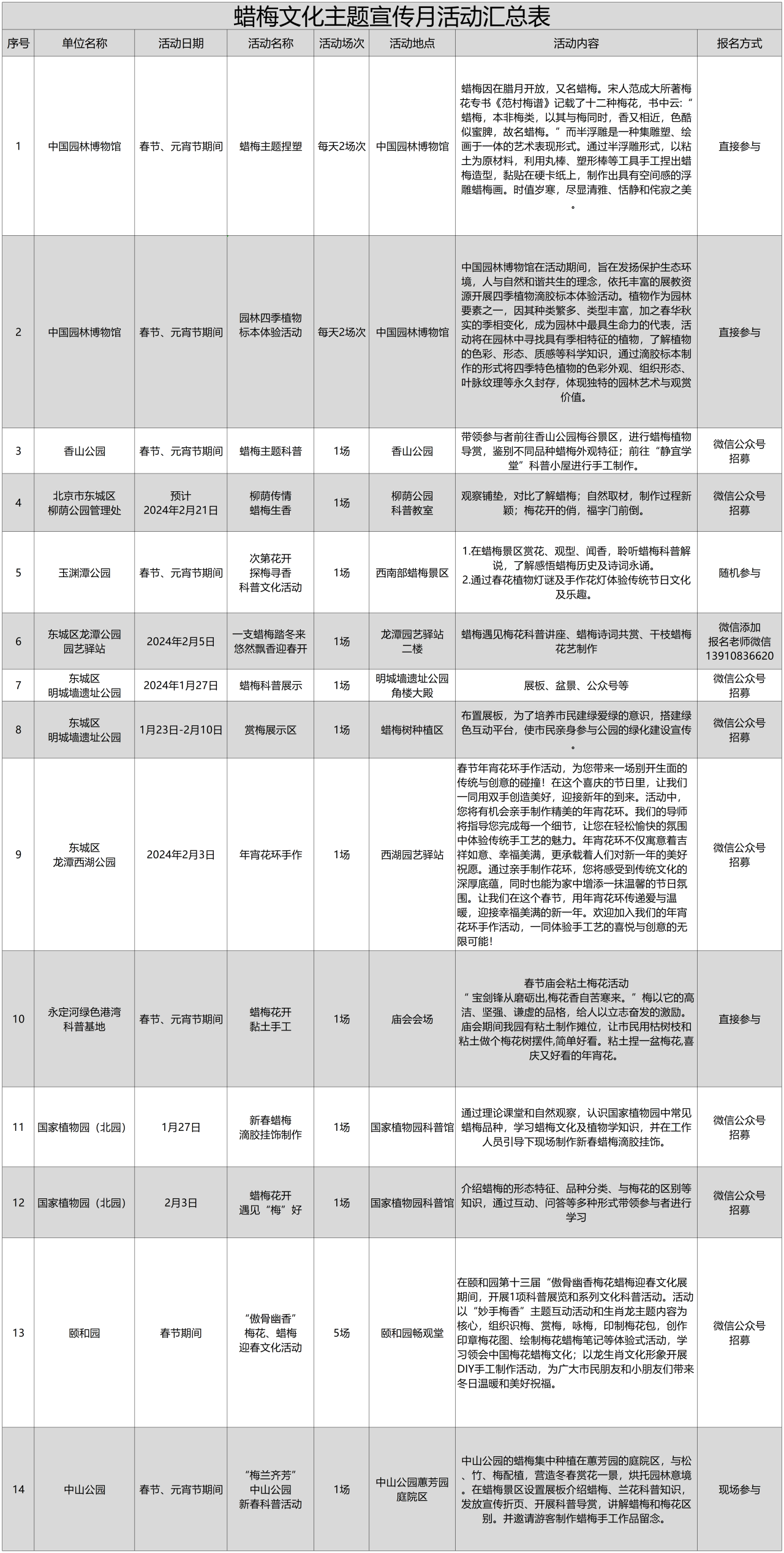 蜡梅文化主题宣传月活动汇总表